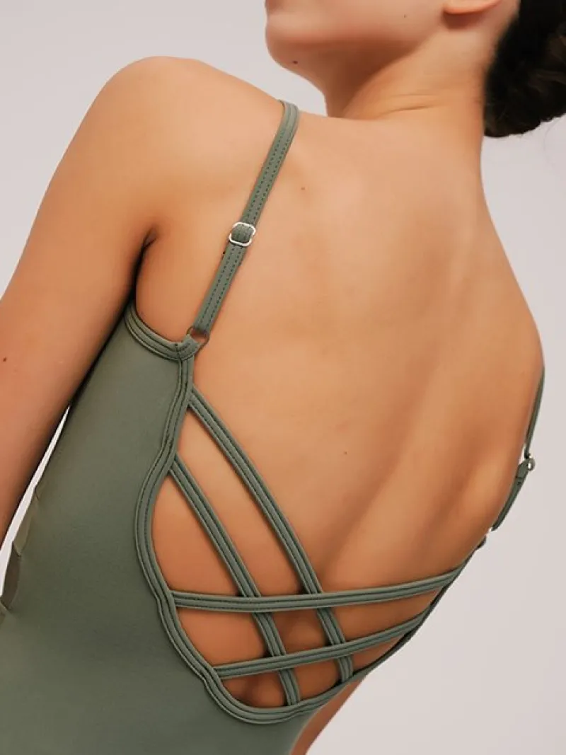 Denne fantastiske dragt i den skønne olivengrønne farve har mesh udskæringer og kryds på ryggen. Derudover er der tynde justerbare stropper og en moderat blød v-formet halslinje.