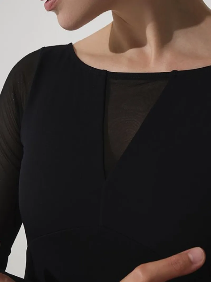 Den har kugleformet hals og dyb v ryg med mesh detalje. V-mesh udskæringen på fronten giver, sammen med en smuk med brystsøms-detalje, illusionen af en længere hals.