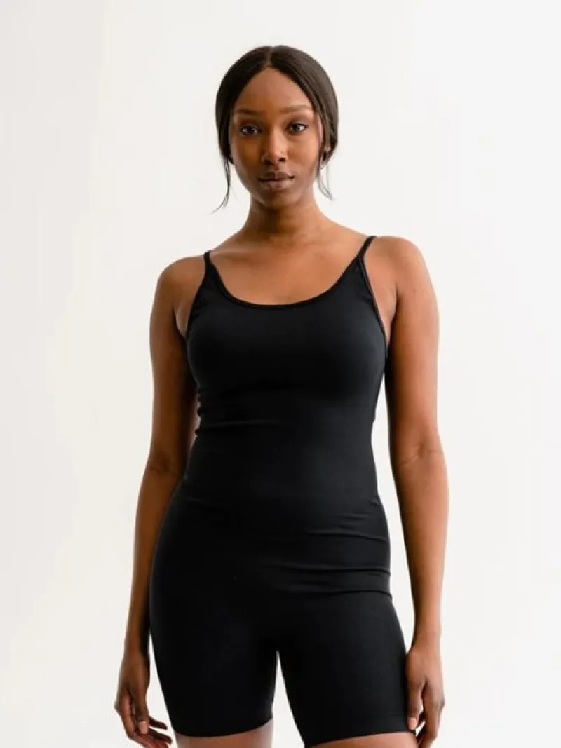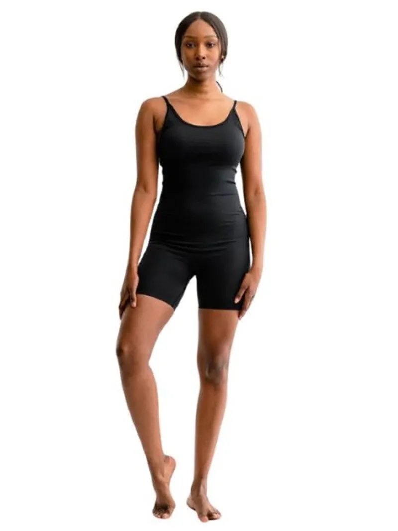 Sort kort sømløs Izzy jumpsuit med tynde justerbare skulderstropper. Rib struktur der giver en lækker og behagelig følelse. Rund halsudskæring og dybere i ryggen. Brug den til en pilates-session, til hotyoga eller alle former for yoga og træning. Kan også være cool som hverdagsbrug for et sporty look. Nem at hoppe i og tage af.