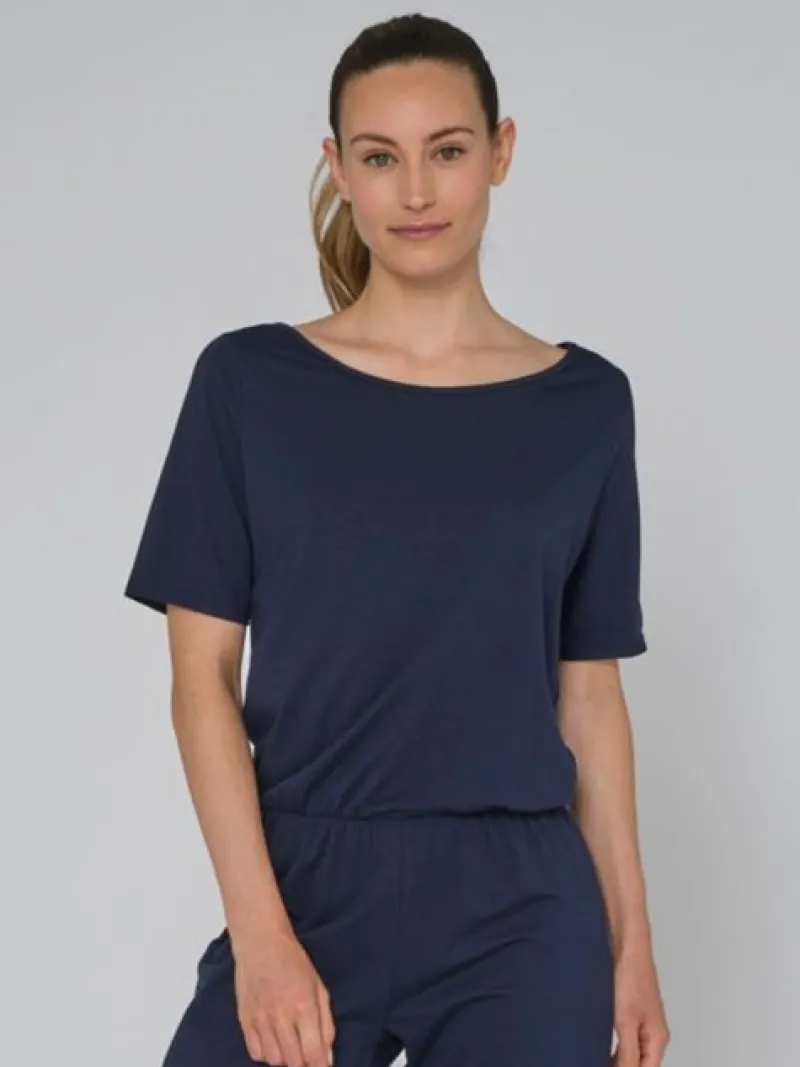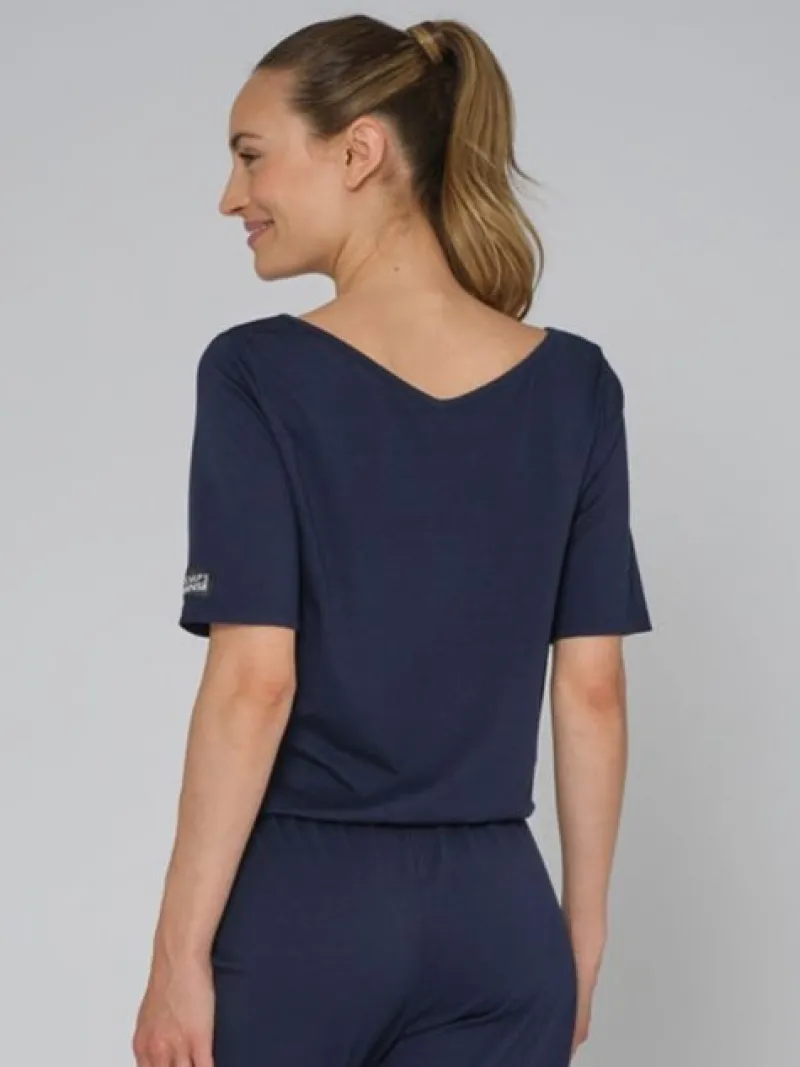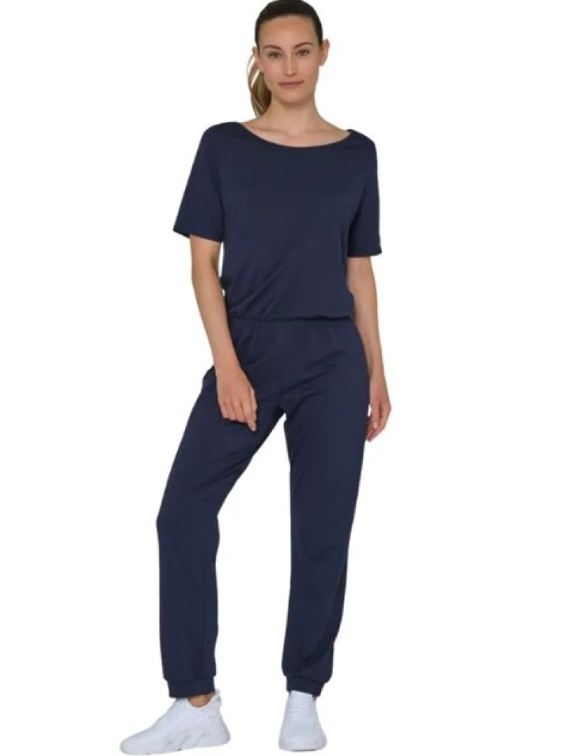 Mørkeblå heldragt med korte ærmer til dans og yoga fra Temps Danse. Denne alsidige heldragt er ideel til yoga, moderne dans og afslappet hverdagsbrug. Designet med kortærmede og en elastisk talje tilbyder den en afslappet pasform, mens de tilspidsede ben med ankelmanchetter tilføjer et moderne touch. Fremstillet af en lækker blanding af 48% bomuld, 47% modal og 5% spandex, sikrer det både åndbarhed og bevægelsesfrihed. Vaskes ved 30°C.
