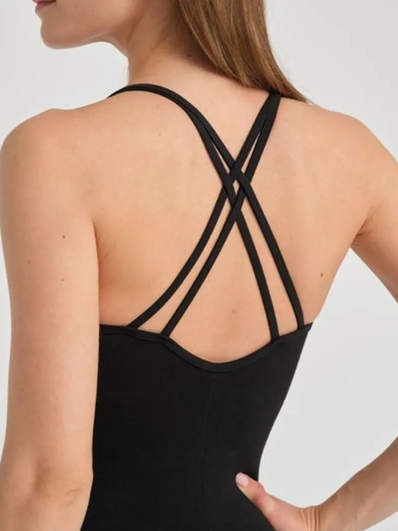 Super blød TempsDanse heldragt med lange ben. Heldragten er sort med små stropper og har en flot ryg med kryds. Dragten er i et blødt viscose materiale og er helt perfekt til hot yoga, yoga og Pilates. 92% viscose/8% elastan