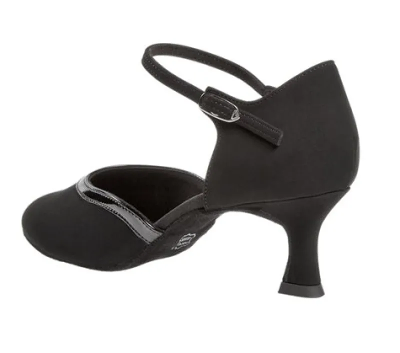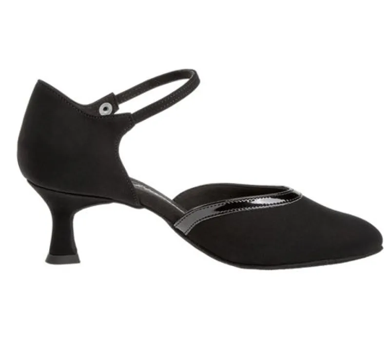 Sorte dansesko fra Diamant i ruskind og lak er af højeste kvalitet og kommer fra Italien. Skoene har et fint lakbånd rundt ved vristen og en trinløst justerbar trykknapspænde til hurtig åbning og lukning på en hælstrop. Med en elegant 5 cm flare hæl er disse sko perfekte til dans. Modellen passer til en almindelig fod og har en indvendig foring af åndbar, antibakteriel og fugtabsorberende mikrofiber fra en italiensk premium-producent. Disse sko er håndlavet i Tyskland og er ideelle for dansere, der ønsker stil, komfort og kvalitet.