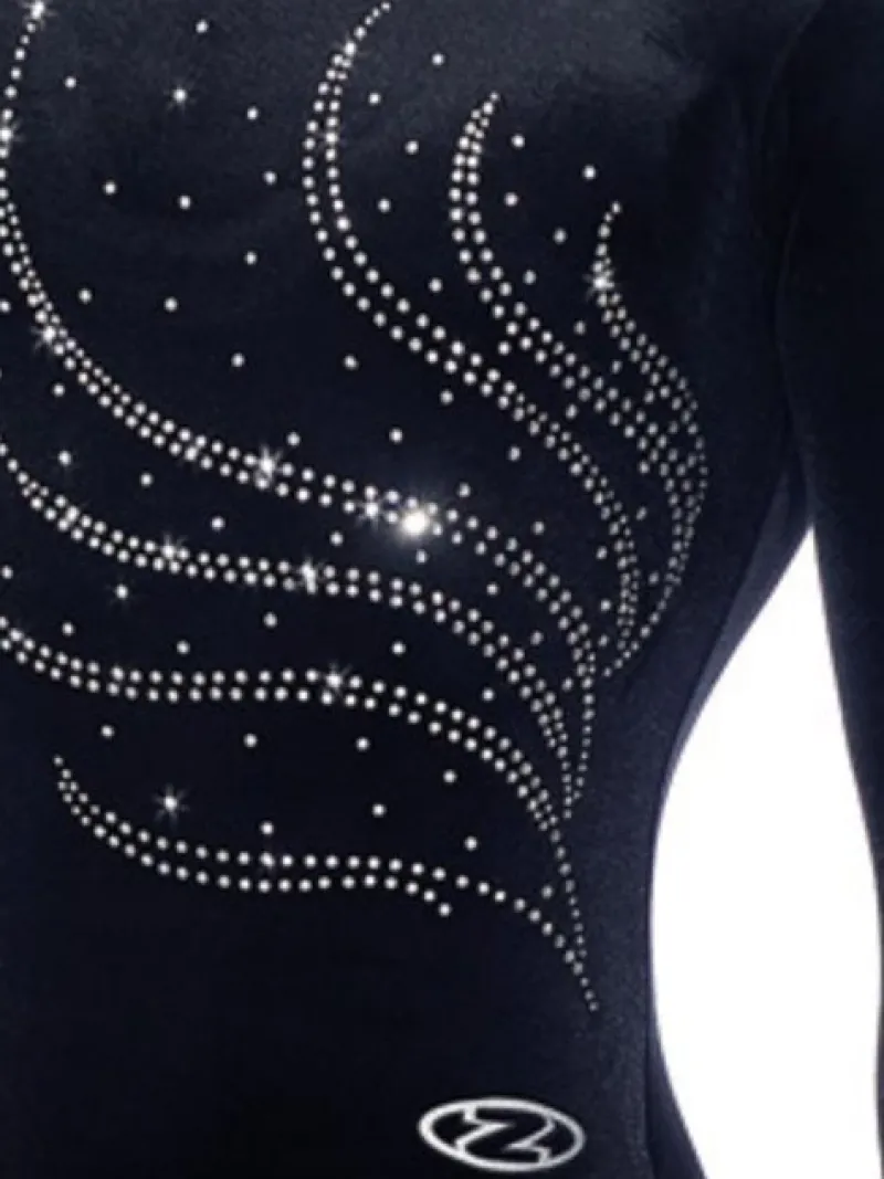 Sort velour gymnastikdragt til piger fra The Zone med lange ærmer. Med masser af sølv rhinsten på fronten. Fremstillet af lækker blød velour bestående af 87% poliamid og 13% lycra elastan. God kvalitet, pasform og populær blandt gymnaster