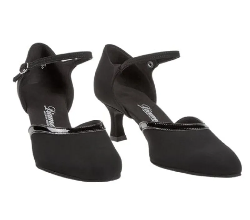 Sorte dansesko fra Diamant i ruskind og lak er af højeste kvalitet og kommer fra Italien. Skoene har et fint lakbånd rundt ved vristen og en trinløst justerbar trykknapspænde til hurtig åbning og lukning på en hælstrop. Med en elegant 5 cm flare hæl er disse sko perfekte til dans. Modellen passer til en almindelig fod og har en indvendig foring af åndbar, antibakteriel og fugtabsorberende mikrofiber fra en italiensk premium-producent. Disse sko er håndlavet i Tyskland og er ideelle for dansere, der ønsker stil, komfort og kvalitet.