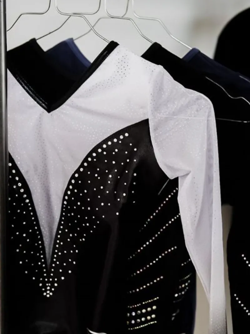 Elegant sort/hvid skinnende gymnastikdragt piger The Zone. Gymnastikdragten er designet med lange mesh-ombré ærmer og en flatterende V-udskæring, der kombineres perfekt med det skinnende Nylon/Lycra materiale. Fremhævet med funklende rhinsten på forsiden.