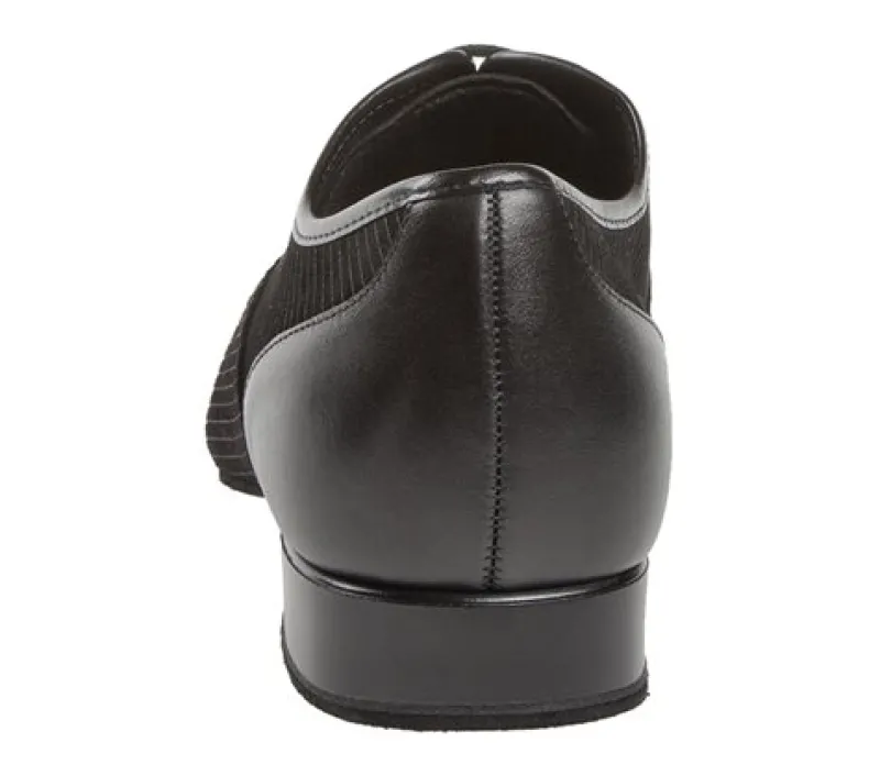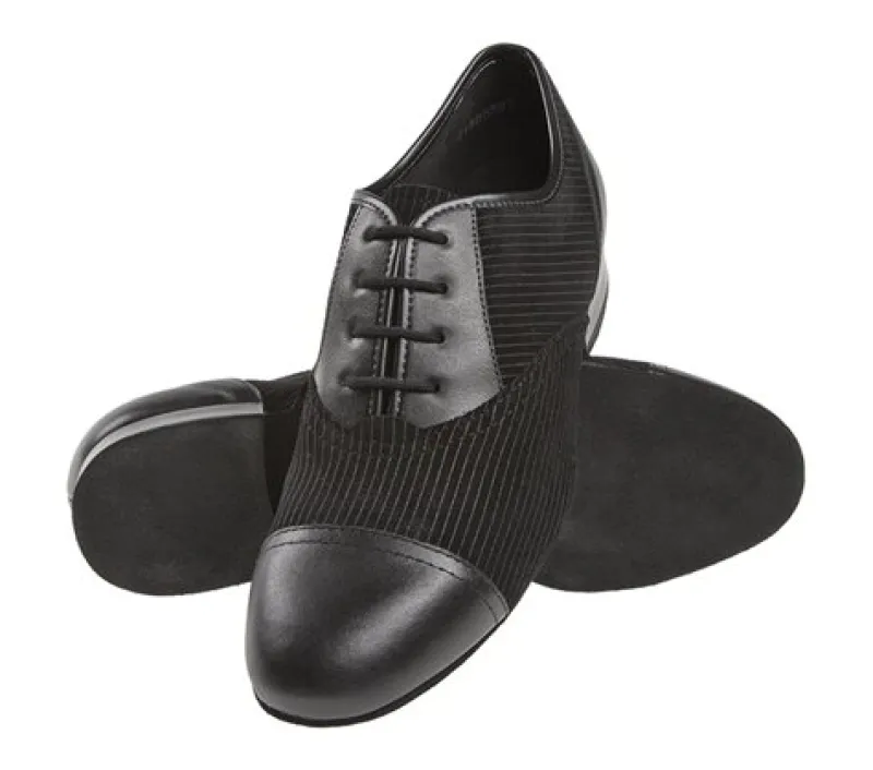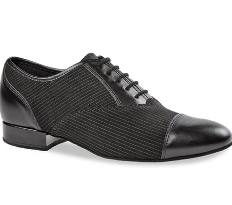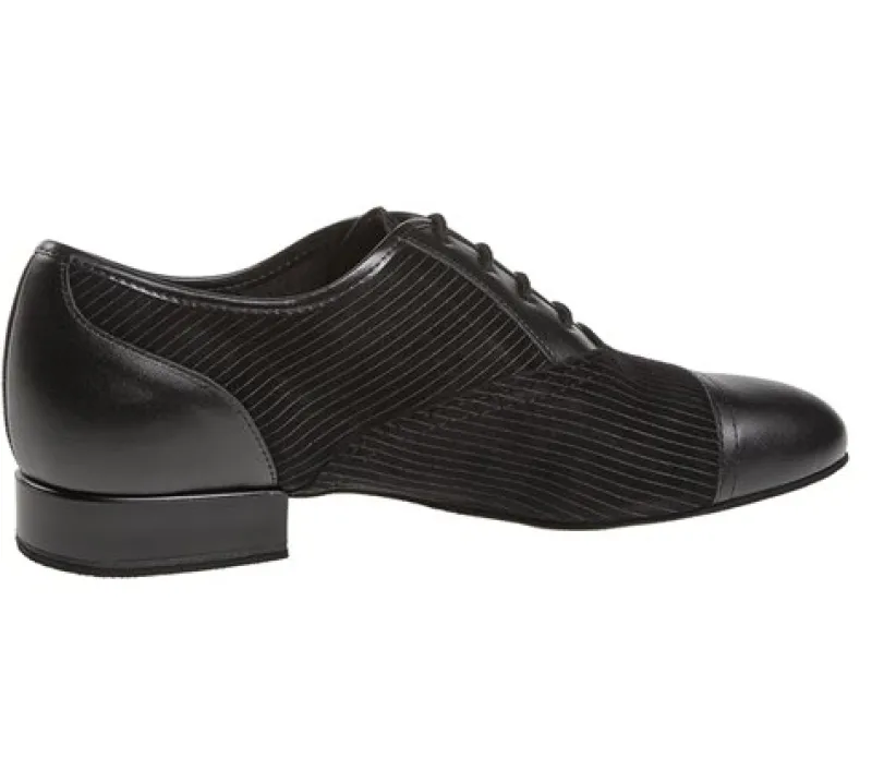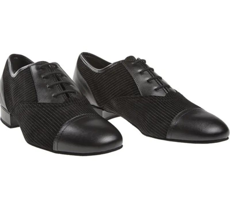 Diamant dansesko til mænd i blødt læder fra Italien kombineret med sort laserruskind med nålestribetmønster. En lidt mere anderledes og spændende dansesko. Klassisk cap-toe Oxford design med lukket 5-hullers snøre.